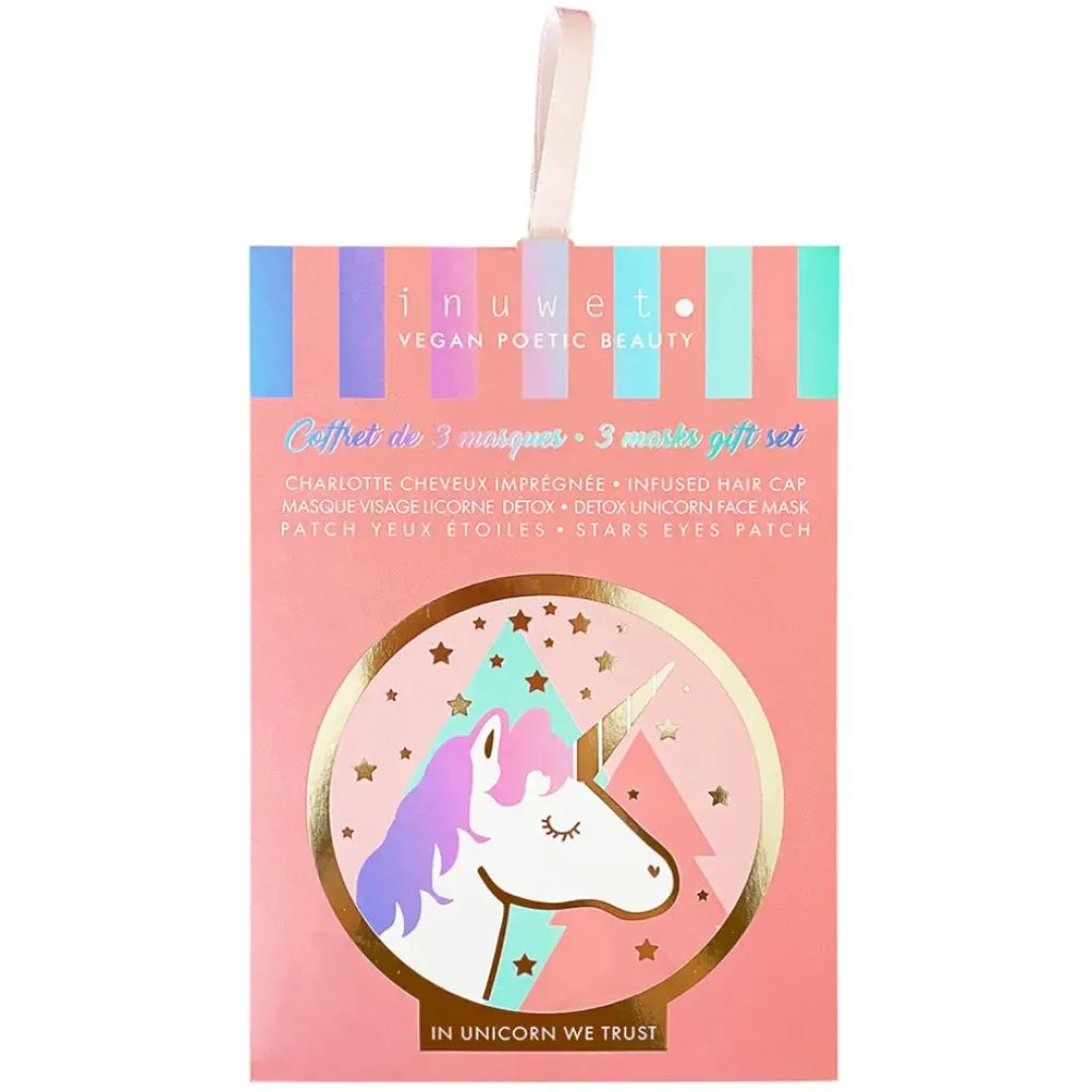Ce set contient trois indispensables : un masque cheveux nourrissant, un masque visage licorne détoxifiant et des patchs yeux en forme d’étoiles pour un regard frais et reposé.