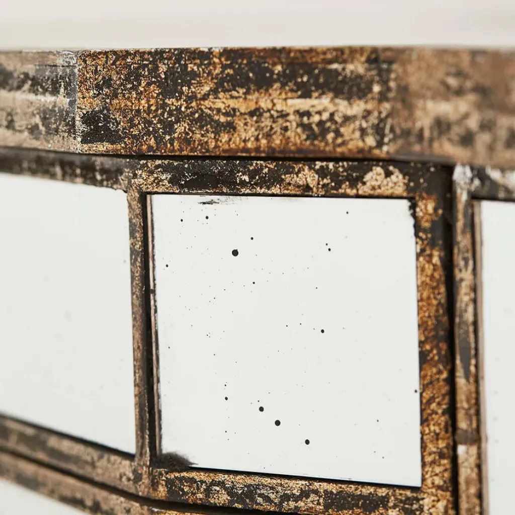 Voici un meuble incontournable du style classique chic : la commode en bois miroir. Elle est ici proposée patinée, comme vieillie, sublimée par le temps qui passe.