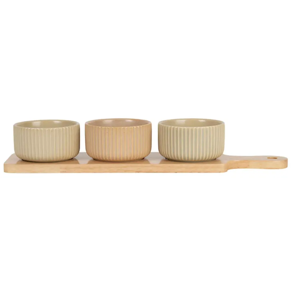 Grâce à ses trois coupelles en grès, vous pouvez facilement présenter différentes sauces, tapenades, ou petites collations.