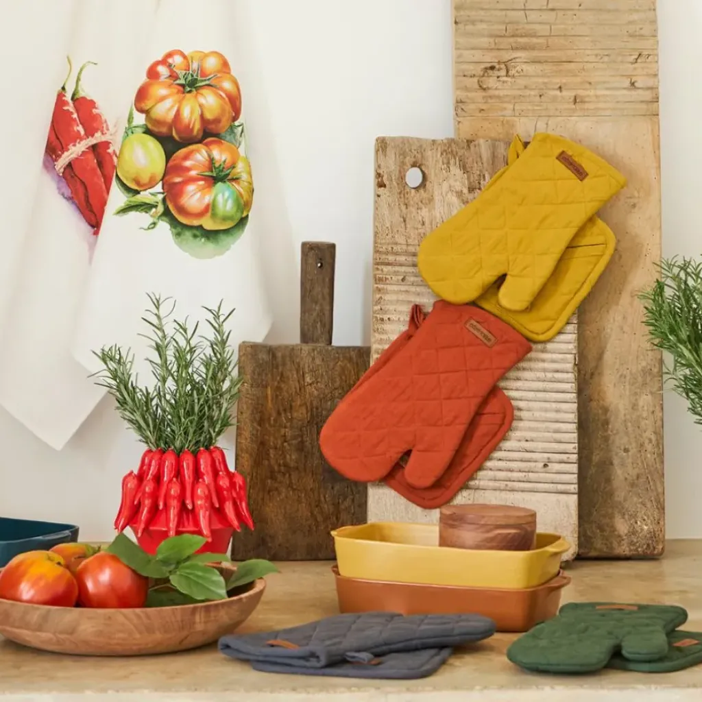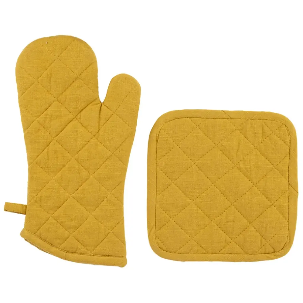 Découvrez l’accessoire indispensable pour votre cuisine : le duo gant et manique en coton couleur moutarde de Cellier.