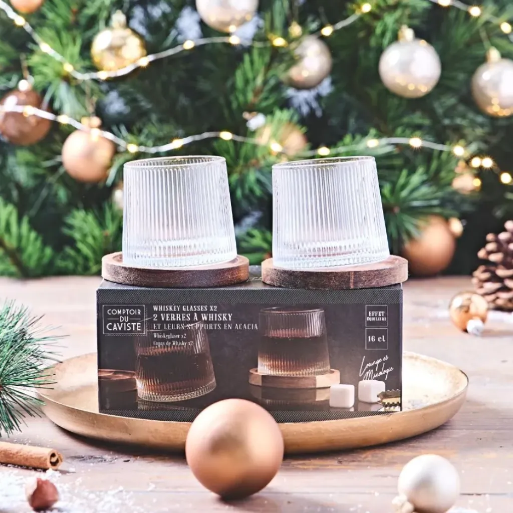 Découvrez un duo incontournable pour les amateurs de whisky avec ce lot de 2 verres accompagné de son support en acacia.