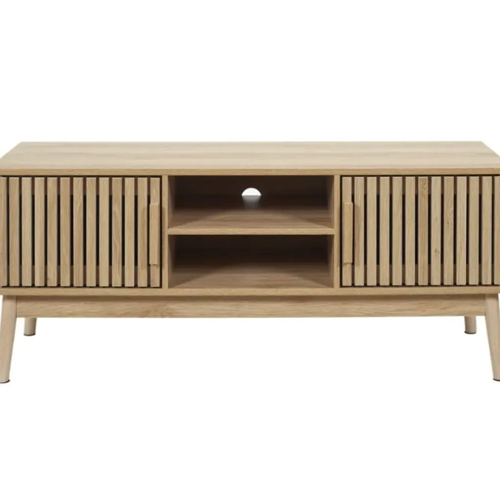 Grâce à son design épuré et son bois naturel, le meuble TV Kara s’harmonisera facilement avec différents styles de décoration, qu’ils soient modernes, rustiques ou contemporains. »Bois – Panneaux de particulesBois – MDF »