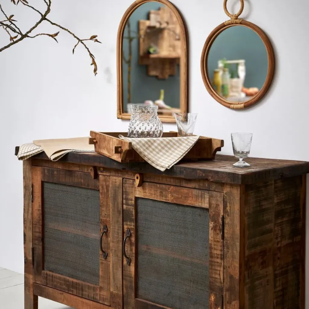 Un choix parfait pour ceux qui cherchent à allier design contemporain et charme naturel.Rotin et mdf et miroir.