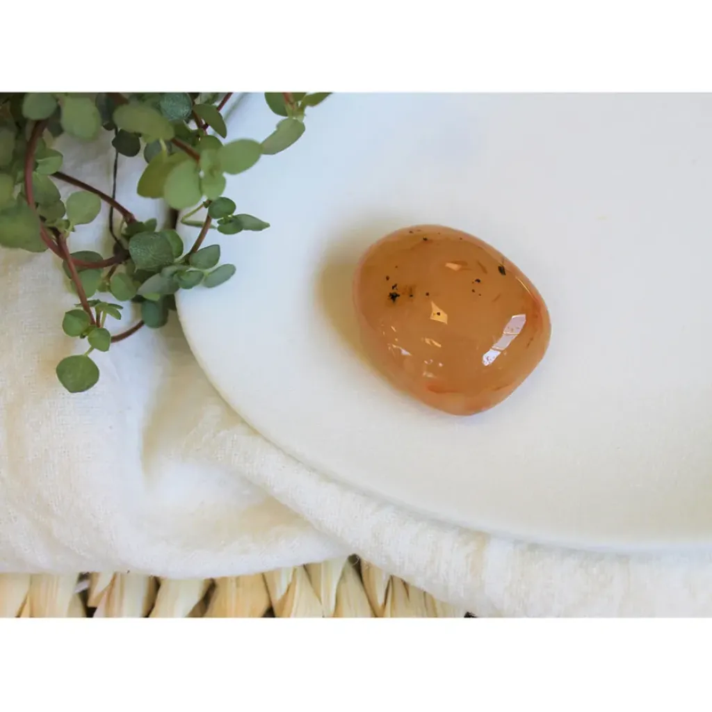 Elle permet de garder un état esprit positif et d’éloigner les doutes.Pierre roulée en pierre naturelle de cornaline.