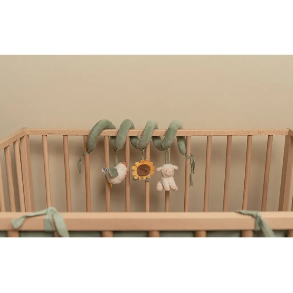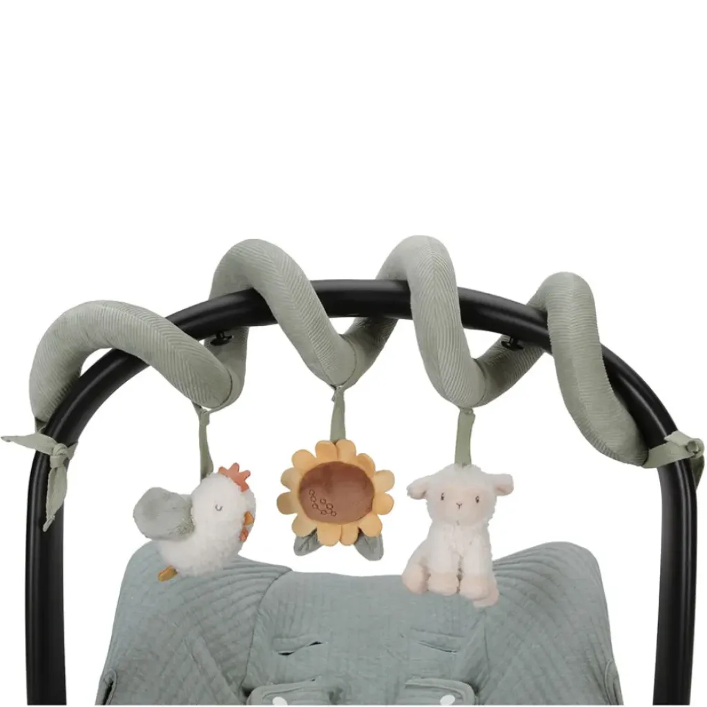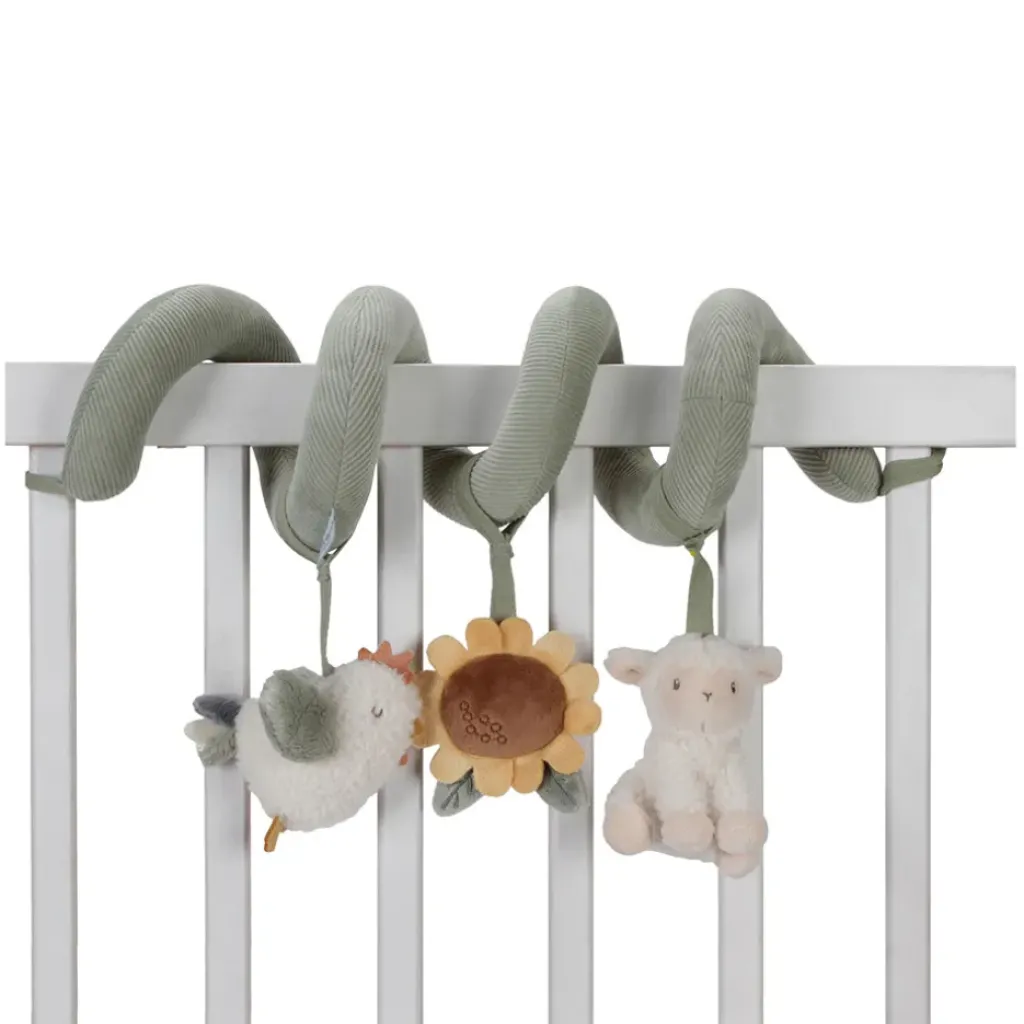 La spirale d’activités est en velours côtelé avec du coton et comporte un petit mouton, un poulet joyeux et une belle tournesol.