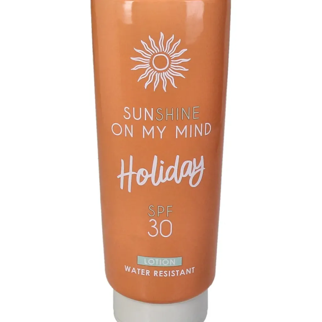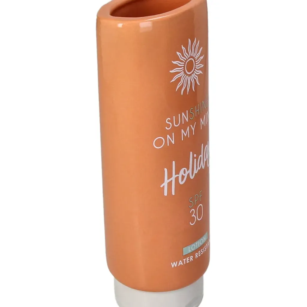 Ce vase en faïence orange adopte la forme amusante d’un tube de crème solaire pour une touche déco pleine de fraîcheur et de bonne humeur.