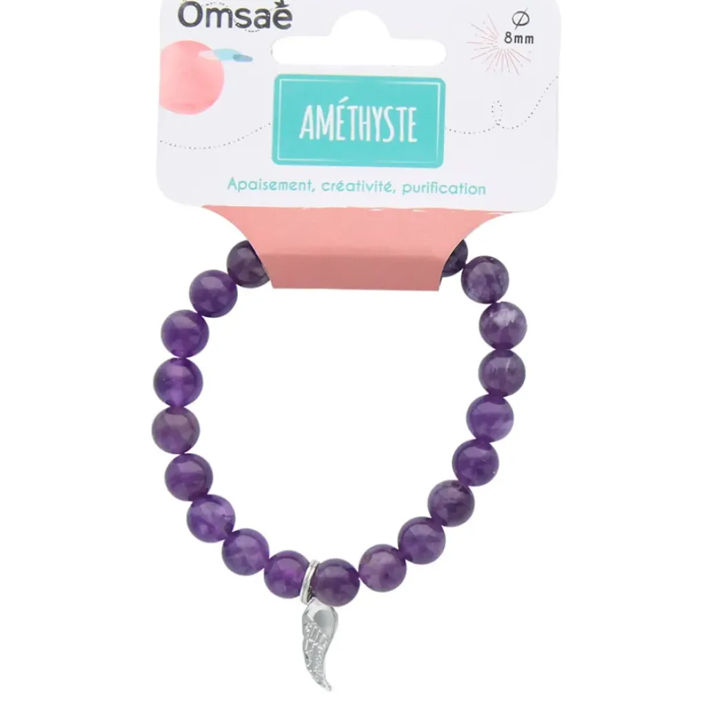 Bracelet élastique composé de perles en pierre naturelle d’améthyste et d’une breloque en aile d’ange argentée.