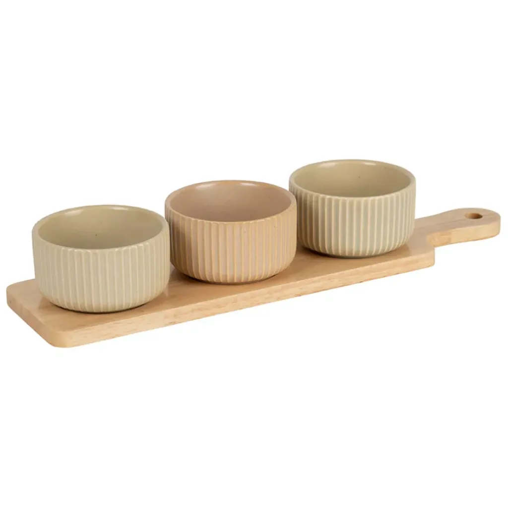 Grâce à ses trois coupelles en grès, vous pouvez facilement présenter différentes sauces, tapenades, ou petites collations.