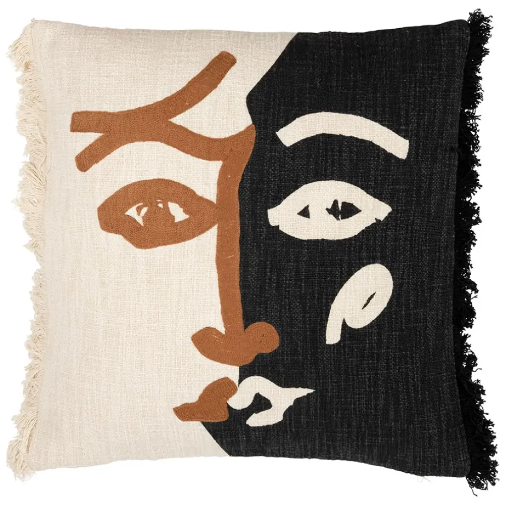 Coussin brodé écru et noir de dimensions 45x45cm avec housse en madeira. Parfait pour ajouter une touche élégante à votre intérieur.Coton / Cotton