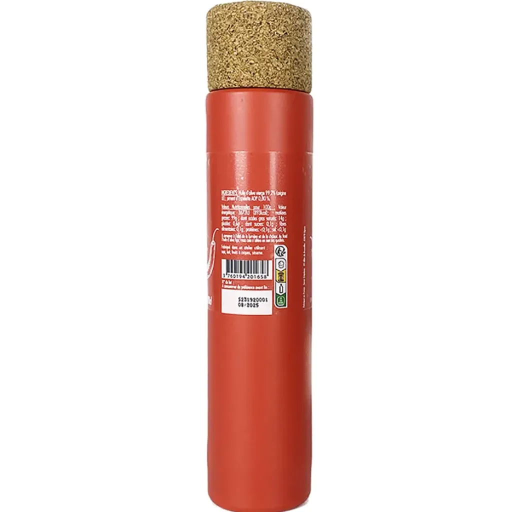 En bref, c’est l’ingrédient idéal pour ceux qui recherchent une manière simple et savoureuse de pimenter leur quotidien.Huile d’olive vierge 99,2% (origine UE), piment d’Espelette AOP 0,80 %.