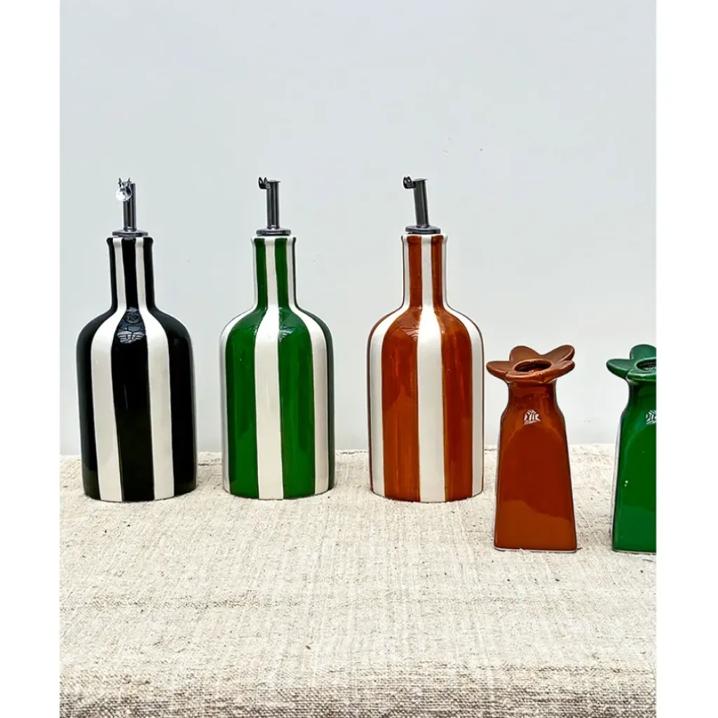 Ajoutez une touche originale à votre cuisine avec cet huilier en faïence rayé marron.