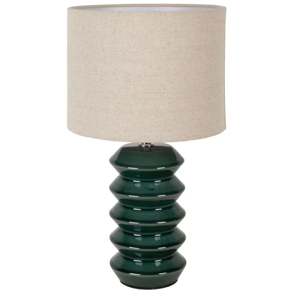 Son design innovant associe harmonieusement un socle en céramique verte émeraude et un abat-jour en lin écru, créant un contraste visuel attrayant.
