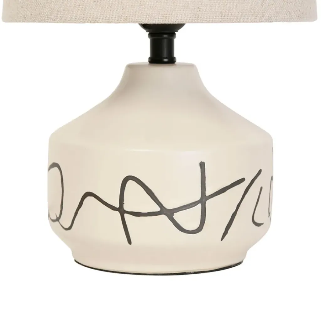 Lampe visionnaire en porcelaine et lin de couleur beige, mesurant 33cm de hauteur. Offrez-vous un éclairage élégant et contemporain pour illuminer votre intérieur.CRÉATION UNIQUE