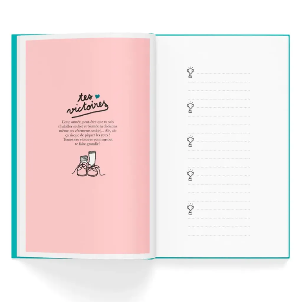 Un cahier souvenirs à compléter pour ne rien oublier de ses 2 à 10 ans. 5 pages à remplir par an sur son caractère, ses amis, l’école, ses petites et grandes victoires de l’année et les évènement marquants.