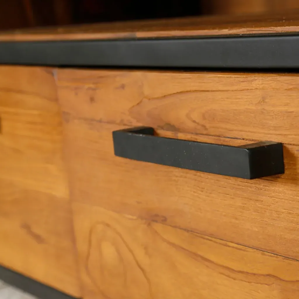 Meuble TV 3 tiroirs sur rails métal ouverture totale 1 grande niche – Teck massif naturel recyclé – Fond CP teck – Poignée et pied métal.Caisson, portes et tiroirs : chêne massif, vernis nitrocellulosique Etagères : MDF placage chêne, vernis nitrocellulosique Pieds et barres de maintien : acier, peinture à l’huile, brossage à la main
