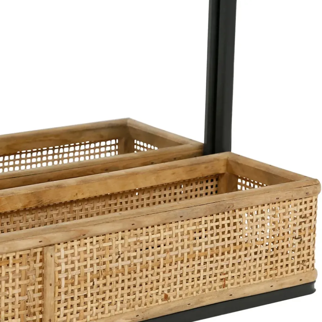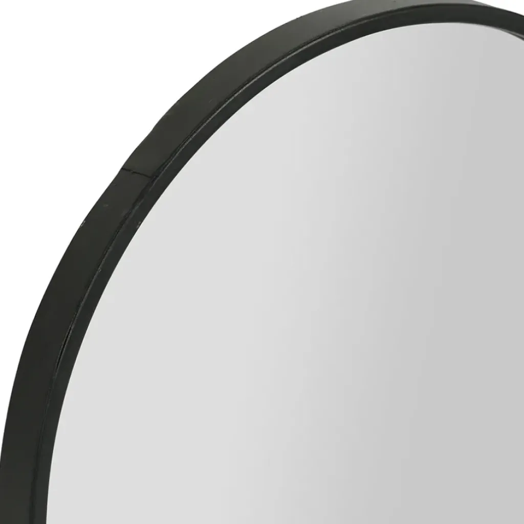 Ajoutez une touche moderne et fonctionnelle à votre espace avec notre miroir en fer noir aux lignes arrondies, accompagné d’une étagère en bambou naturel.