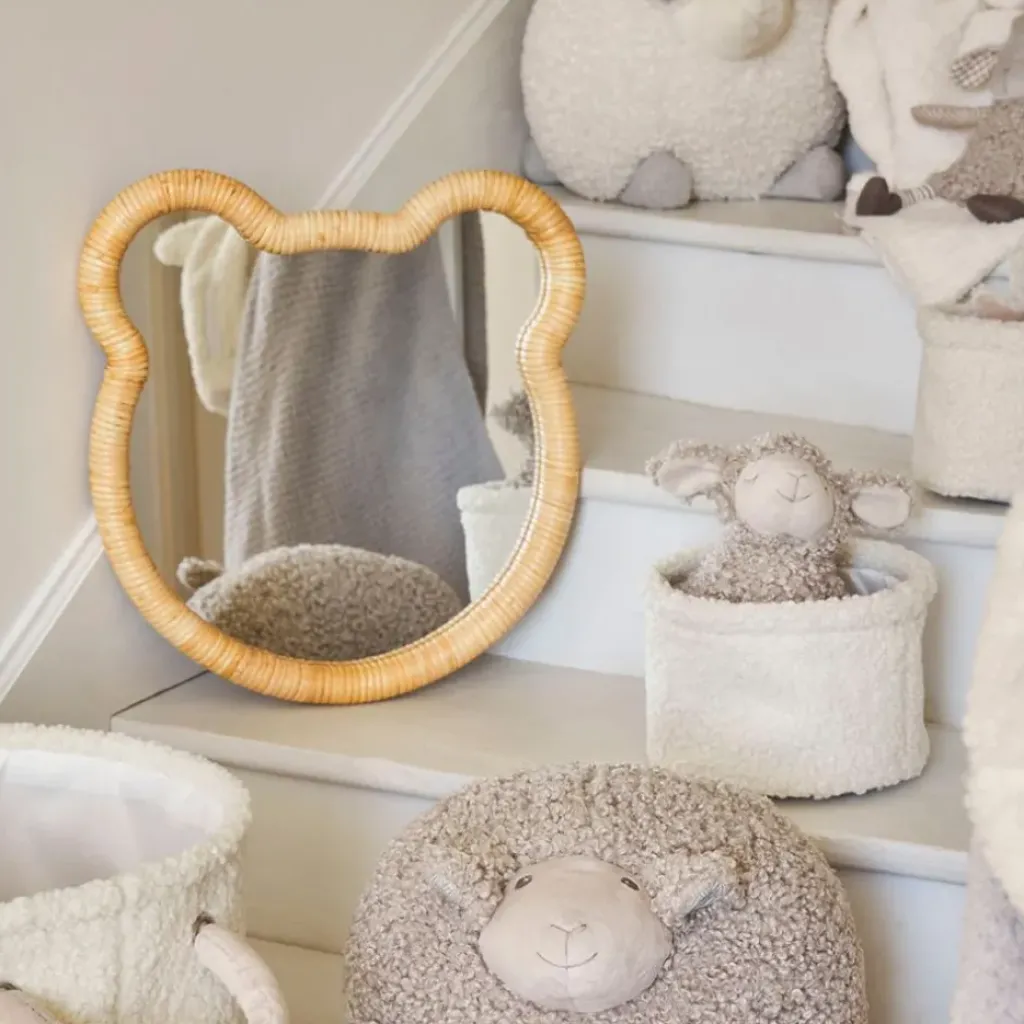 Découvrez ce charmant miroir en forme d’ourson fabriqué en rotin et contreplaqué de 40×42 cm, conçu spécialement pour égayer la chambre des enfants.