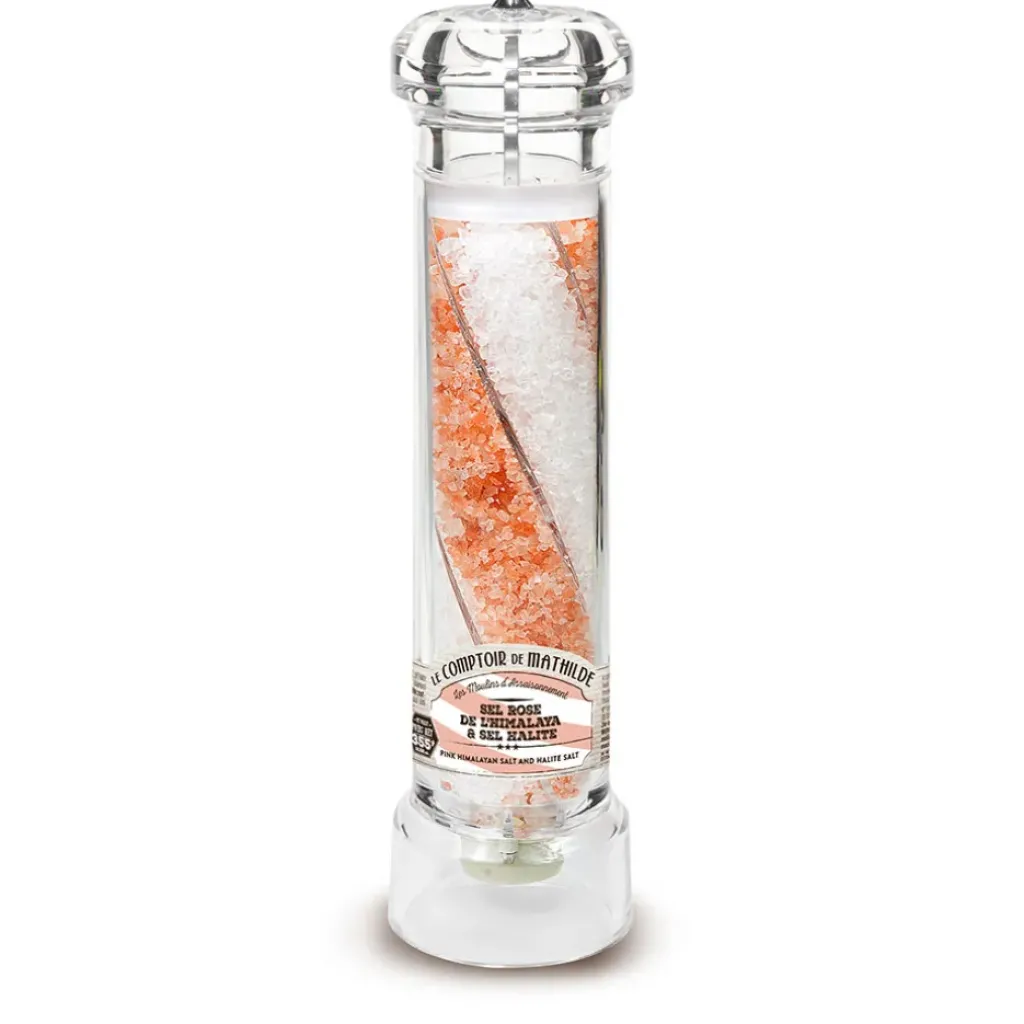 Découvrez le moulin de sel rose de l’Himalaya et sel blanc halite XL de 355g, une fusion parfaite pour sublimer vos plats.