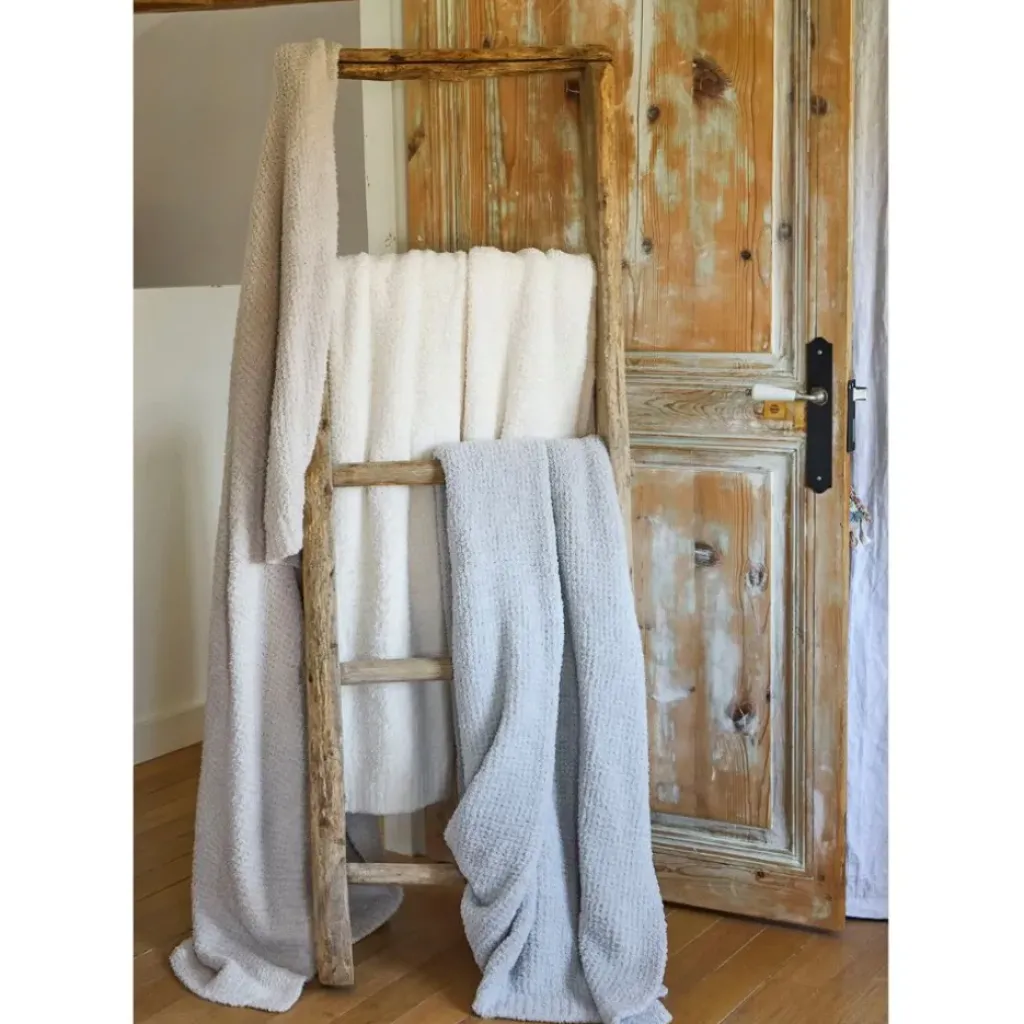 Le plaid en tissu écru offre une texture douce et accueillante qui invite à la détente.