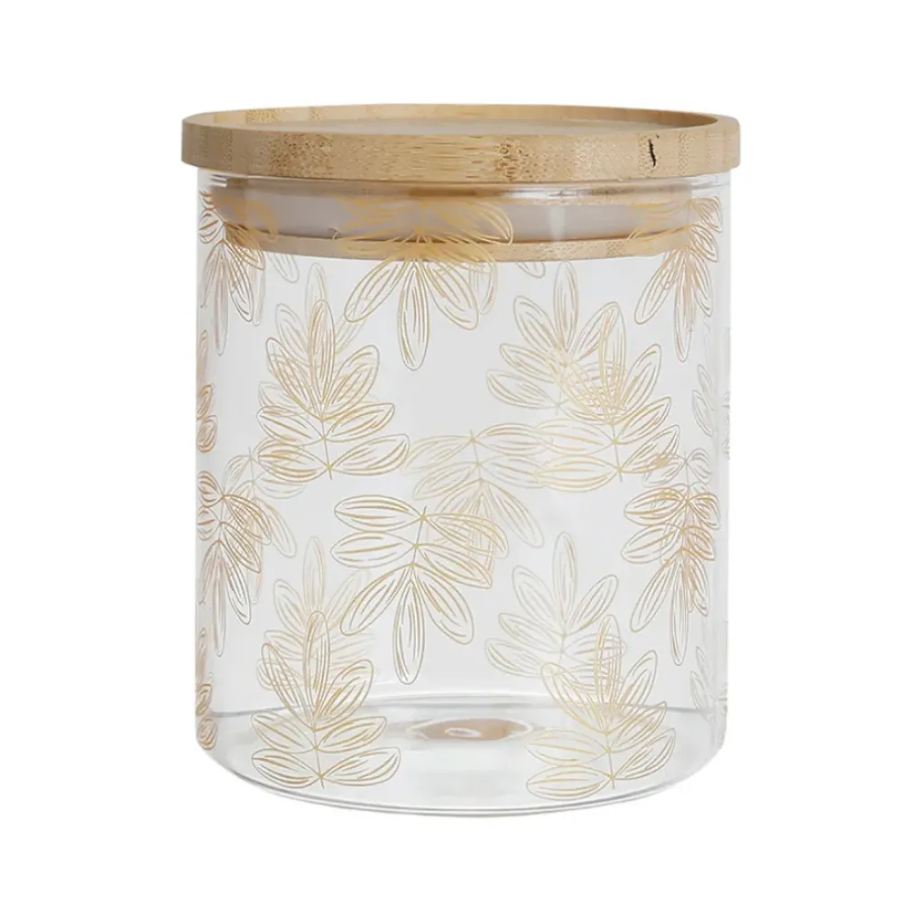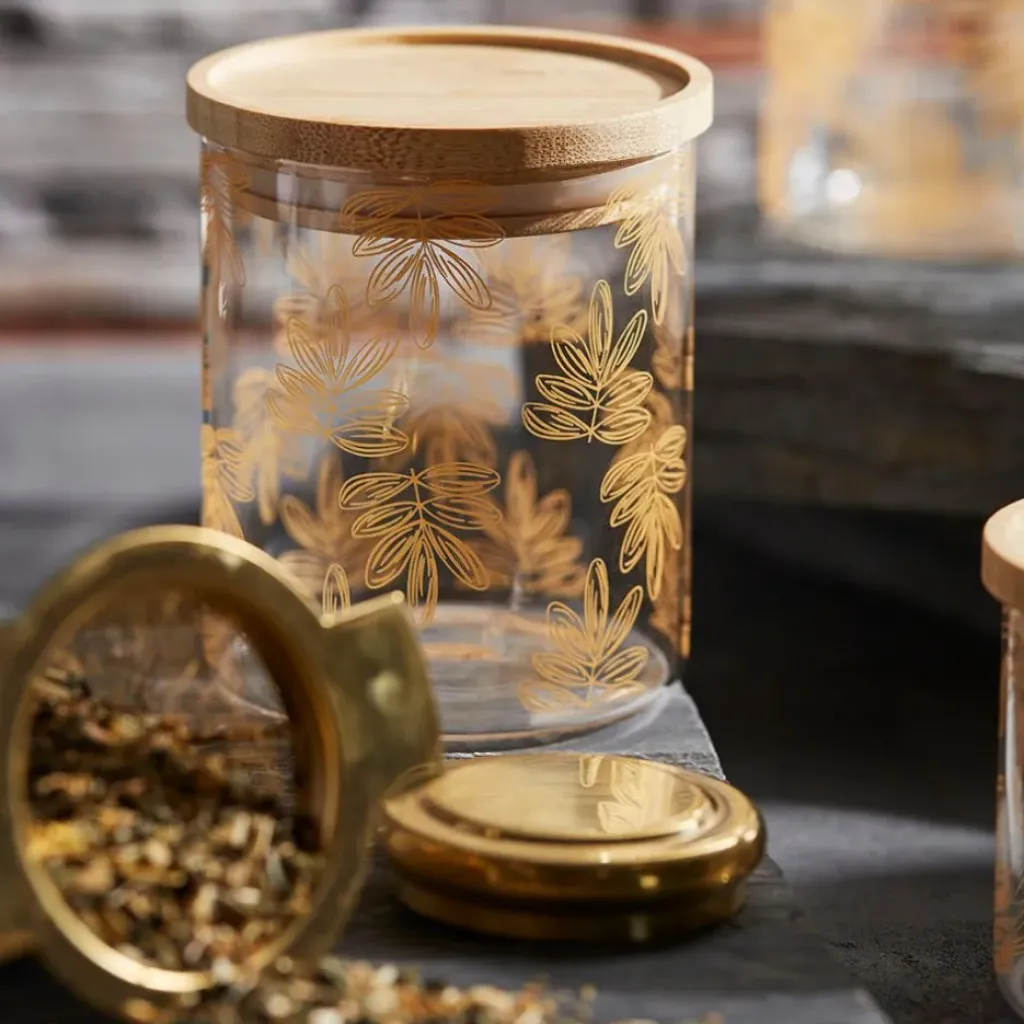 Venez découvrir notre Pot Flaural doré en verre avec couvercle en bambou D9.5Xh11Cm (modèle moyen) de la marque SEMA Design à découvrir sur Fabrique de StylesVerre borosilicate + bambou + silicone / Borosilicate glass + bamboo + silicone