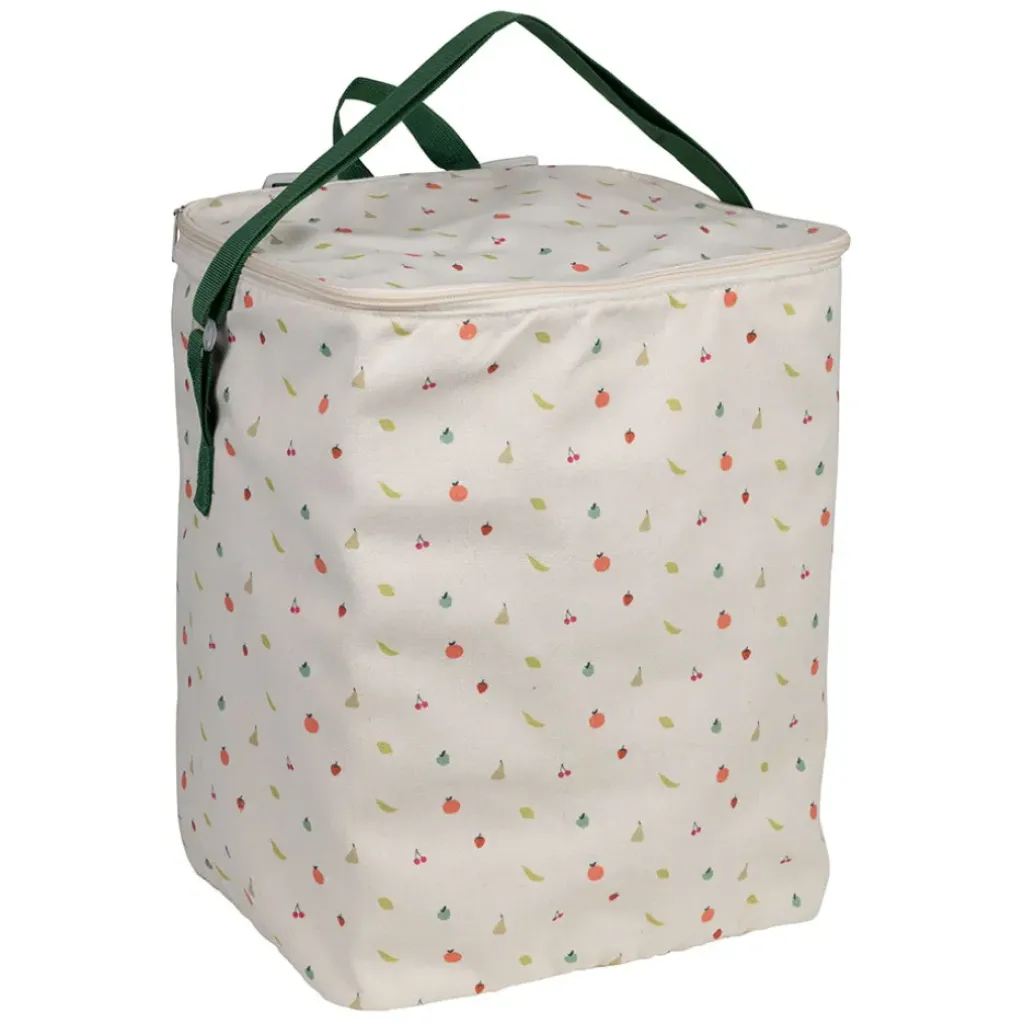 Découvrez notre sac isotherme en coton multicolore orné de motifs fruités, un compagnon idéal pour tous vos déplacements.