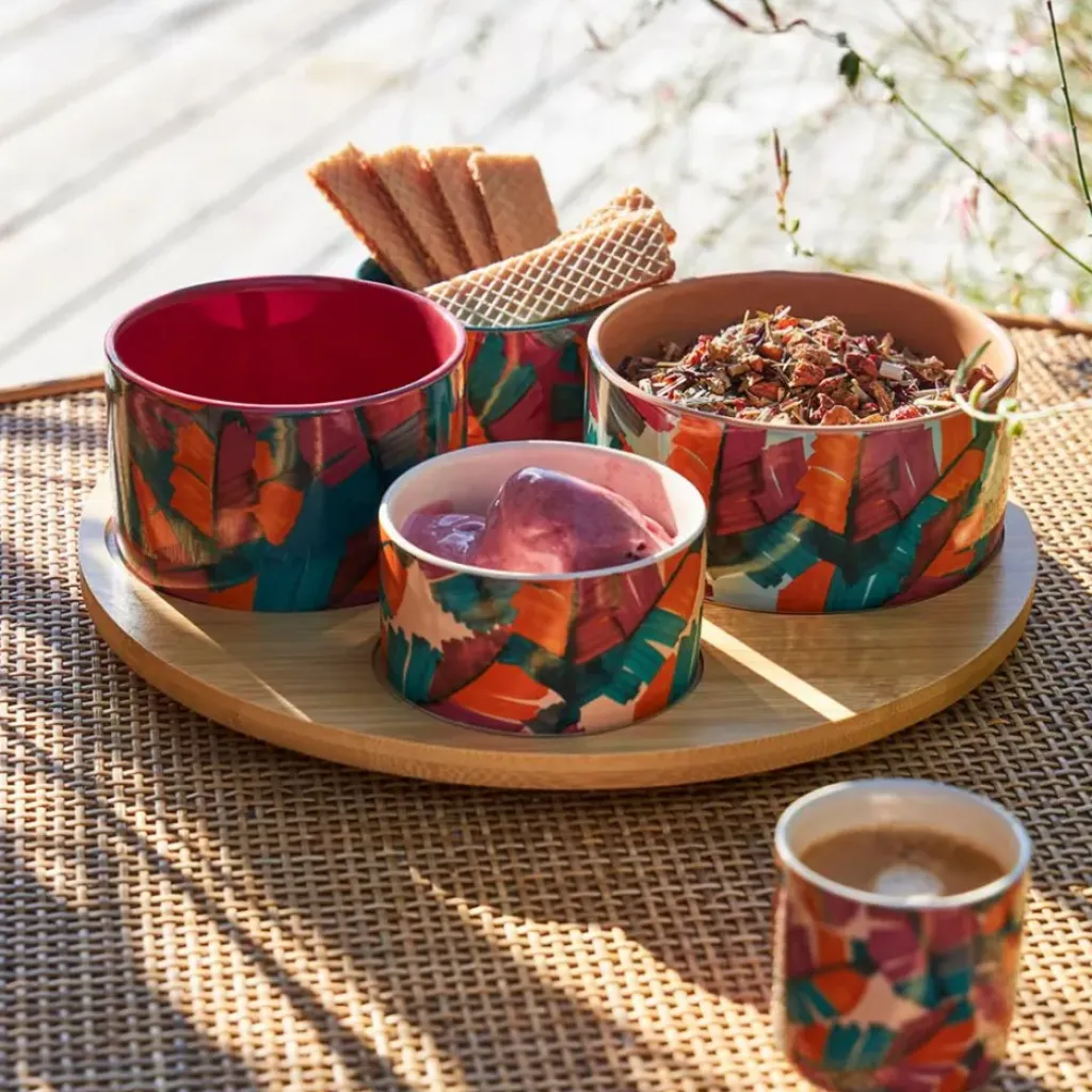 Les coupelles en grès offrent une touche de raffinement et de robustesse, tandis que le bambou multicolore apporte une touche de fraîcheur à votre table.