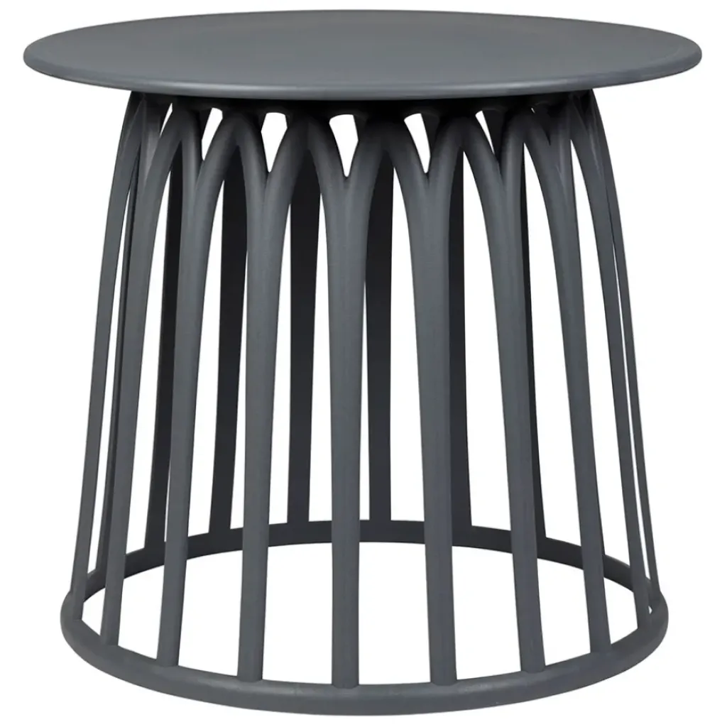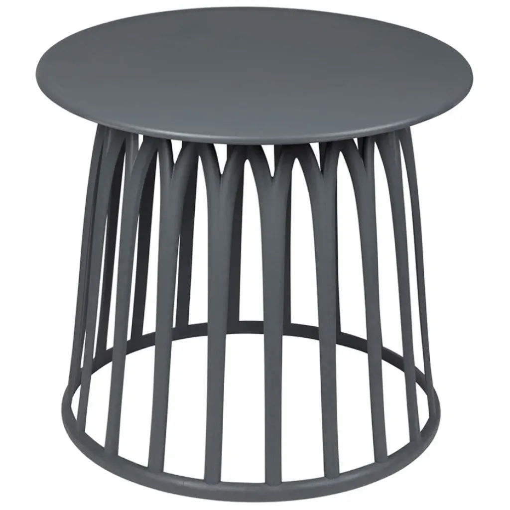 Cette table, au coloris gris moderne, se fond aisément avec divers styles de décoration extérieure.