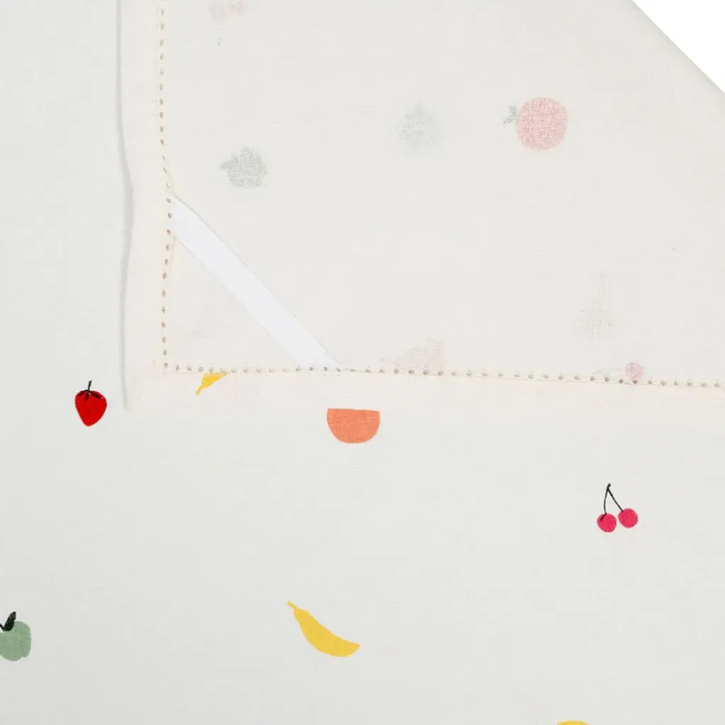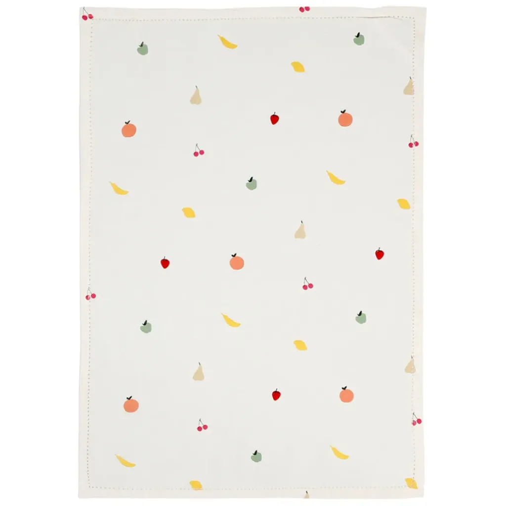 Mesurant 50 x 70 cm, ce torchon écru est orné de nombreux dessins de fruits colorés, apportant une note vive et joyeuse à votre espace culinaire.